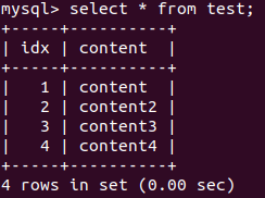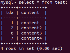 아래는 테스트할 예시다. 컬럼은 인덱스 컬럼(auto increment)과 컨텐트 컬럼만 존재하고 인덱스는 물론, 컨텐트 컬럼의 값들 역시 겹치지 않게 유니크 키를 걸어놨다.